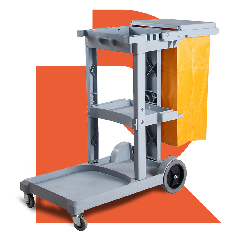 Carro porta útiles de aseo para elementos multiservicio, de diseño liviano y de fácil maniobrabilidad en espacios reducidos. Con bolsa, tapa y plataforma delantera que permite apoyar el carro estrujador. Con espacios de apoyo convenientes para herramientas de mano y otros equipos.